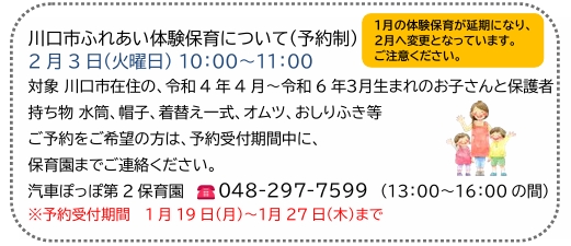 今月より『川口市ふれあい体験保育』が開始となります。詳細は下記のお知らせをご確認ください。